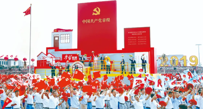 2019年10月1日上午,庆祝中华人民共和国成立70周年大会在北京天安门广场隆重举行。图为群众游行中的“从严治党”方阵。(图片来源:人民视觉)