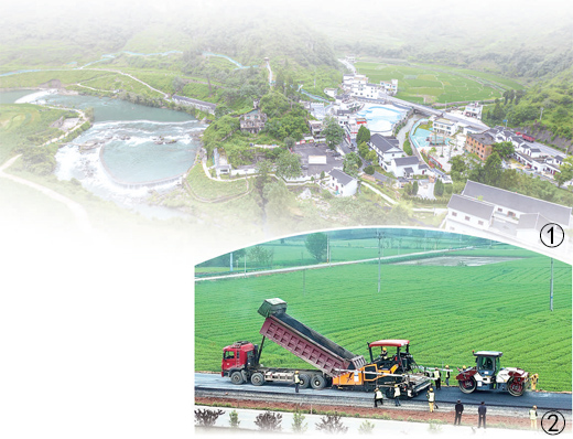 图②:安徽省芜湖市全面推进农村基础设施提档升级,工人们进行沥青摊铺作业。