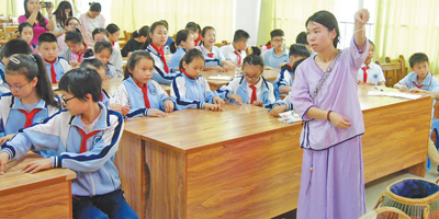 图为刘霞冰进校园给孩子们上竹编体验课。