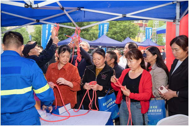 活动场内气氛热烈,场外的科普区域也精彩纷呈。现场通过设立咨询台、摆放宣传展板、发放宣传资料等形式,向广大群众普及火灾、山洪、滑坡等各类自然灾害知识。由各领域专家组成的专家团也在手把手教大家心肺复苏、海姆立克急救、灭火器使用、消防水带连接等实用技巧。现场还设置了应急绳结技巧和烟雾逃生帐篷等体验区,通过现场演示、亲身体验、互动问答等形式,增强了群众风险防范意识和自救互救能力。