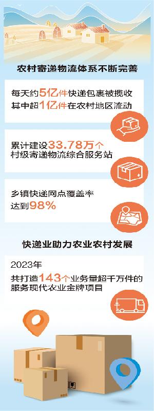 快递下乡到村,带来乡村发展新机遇。自2014年启动实施“快递下乡”工程以来,我国农村寄递物流体系日渐完善,农村快递服务通达率显著提升。邮政快递网络服务不断下沉,有效畅通了城乡经济循环,巩固拓展脱贫攻坚成果,助力乡村全面振兴。