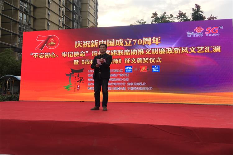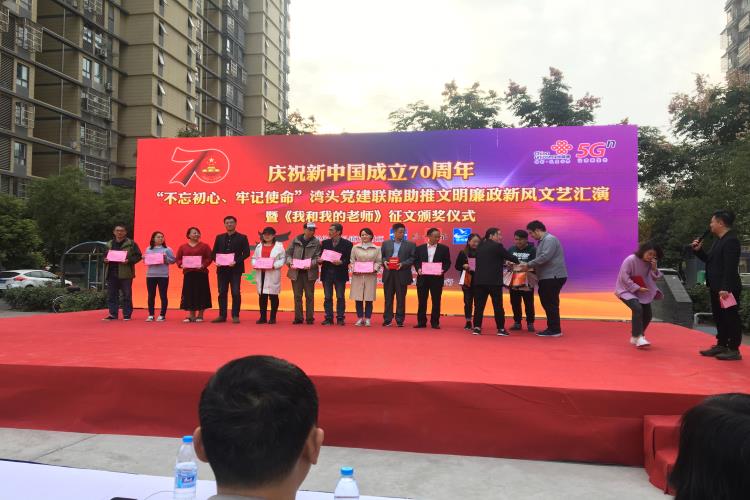 2019年11月2日江苏南京讯(张顺明):2019年11月1日,下午3时,江苏省扬州市广陵区湾头万福社区,举行庆祝新中国成立70周年“不忘初心,牢记使命”廉政新风文艺汇演暨《我和我的老师》征文颁奖仪式。
