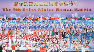 二月七日,第九届亚洲冬季运动会开幕式在黑龙江省哈尔滨市举行。图为演员在开幕式上表演。