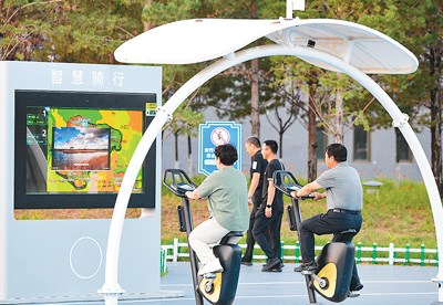 在内蒙古自治区鄂尔多斯市康巴什区智慧体育公园,市民使用智慧骑行器械健身。