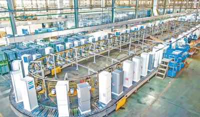 图为江苏宿迁经济技术开发区一家家电企业正在生产组装智能冰箱,以满足广大消费者以旧换新需求。