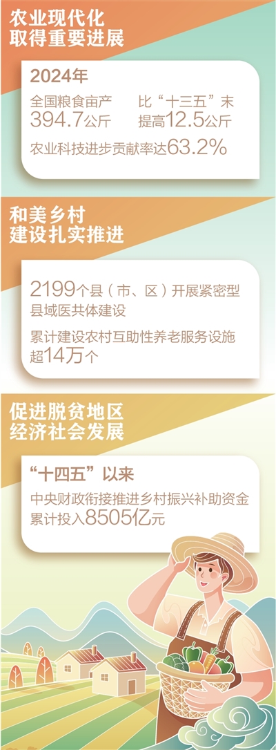 农业是近2亿人就业的产业,农村是近5亿农民常住的家园。“苹果村”“木耳乡”“黄花镇”,富民产业蓬勃发展,水电路气房信等条件明显改善,“村字号”文体活动精彩纷呈……乡村基础设施完备度、公共服务便利度、人居环境舒适度不断提升,亿万农民释放出巨大创造动能和消费潜能。