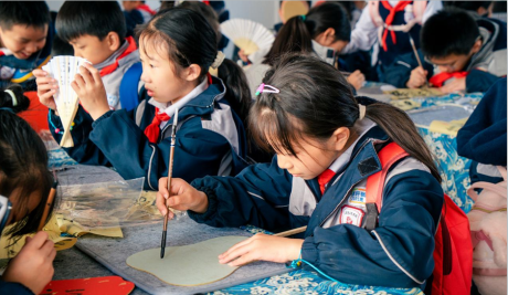 在湖湘文化沉浸式体验中心,同学们书写扇面。