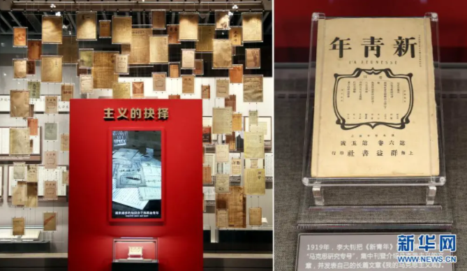 大型立体式视觉置景名为“主义的抉择”,100件五四运动前后传播马克思主义、社会主义的报纸杂志,错落陈列在玻璃墙上。其中,《新青年》第6卷第5号“马克思研究专号”在前端